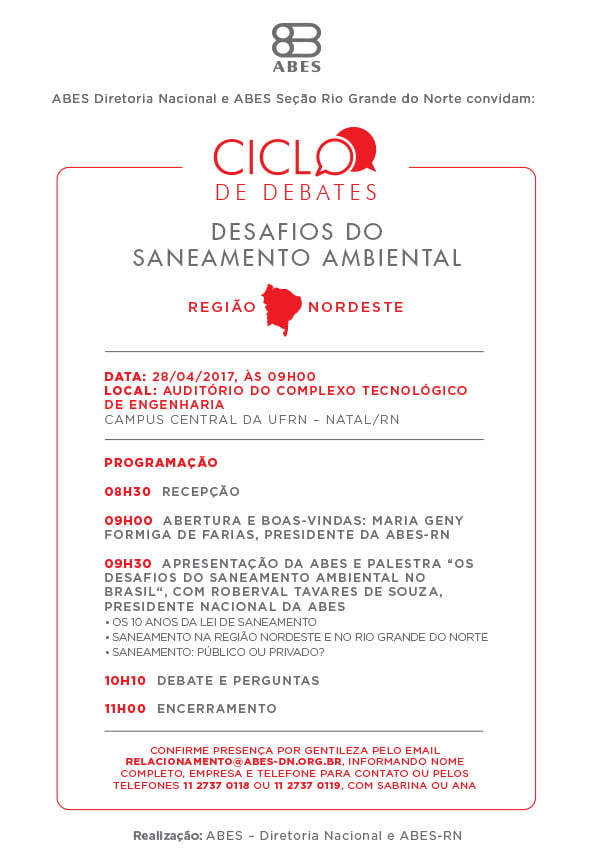 Copyright © 2016 | Todos os direitos reservados. ABES - Associação Brasileira de Engenharia Sanitária e Ambiental | Avenida Beira-Mar, 216, 13º andar, Rio de Janeiro – Tel.: (21) 2277-3900
