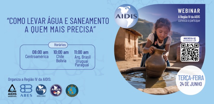 A Região IV da Associação Interamericana de Engenharia Sanitária e Ambiental (AIDIS), composta por Argentina, Brasil, Chile, Paraguai e Uruguai, convida para o webinar “Como levar água e saneamento a quem mais precisa”, que será realizado no dia 24 de junho de 2025, terça-feira, às 11h (horário de Brasília).