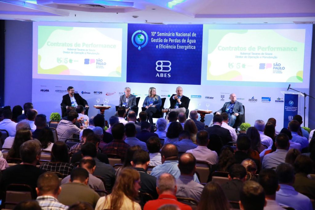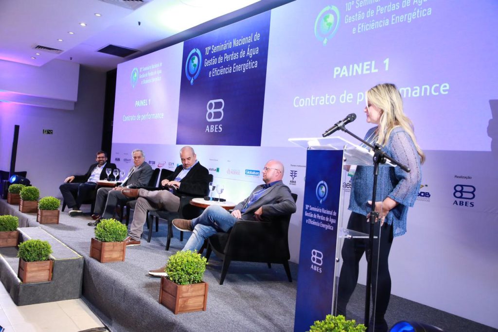 O primeiro painel do 10º Seminário Nacional de Gestão de Perdas de Água e Eficiência Energética, nesta quarta-feira, 8 de novembro, abordou o tema “Contrato de performance”. Para aprofundar o assunto, o debate teve as presenças de Roberval Tavares de Souza, diretor de Operação e Manutenção da Sabesp (Companhia de Saneamento Básico do Estado de São Paulo); Waldecir Colombini, diretor técnico da Enorsul; Carlos Berenhauser, diretor-presidente da Enops Engenharia; e Robson Salmazo Rocha, sócio-gestor na Vitalux Ecoativa. A moderação foi de Milena Aguiar, consultora da IWA (International Water Association).