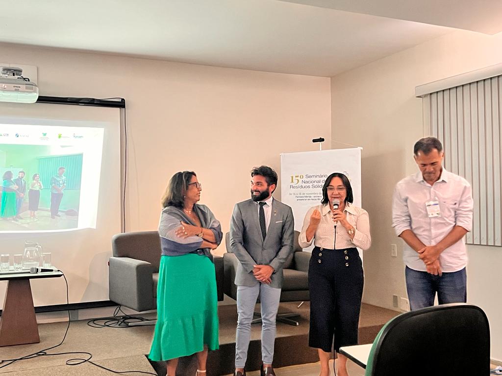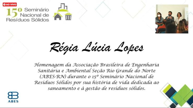 Ao final, a ABES prestou uma homenagem a Lucia Régia Lúcia Lopes, membro da Câmara Técnica de Resíduos Sólidos da ABES-RN, por sua história de vida dedicada ao saneamento e à gestão de resíduos sólidos.