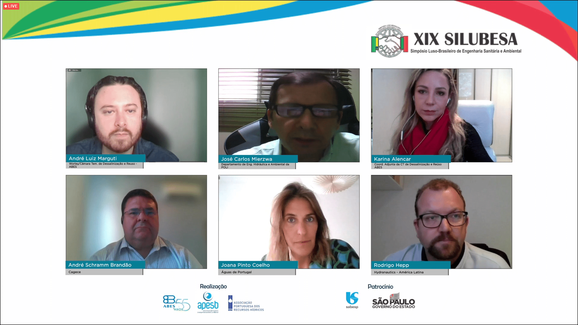 Os especialistas convidados para falar sobre o tema foram José Carlos Mierzwa, chefe do Departamento de Engenharia Hidráulica e Ambiental da POLI-USP; Karina Alencar, coordenadora adjunta da Câmara Temática de Dessalinização e Reúso ABES; André Schramm Brandão, engenheiro de Tecnologia e Desenvolvimento da CAGECE – Companhia de Água e Esgoto do Ceará; Joana Pinto Coelho, engenheira na Direção de Engenharia e Operação na Águas de Portugal – Grupo AdP; e Rodrigo Hepp, gerente de Serviços Técnicos da Hydranautics para a América Latina.