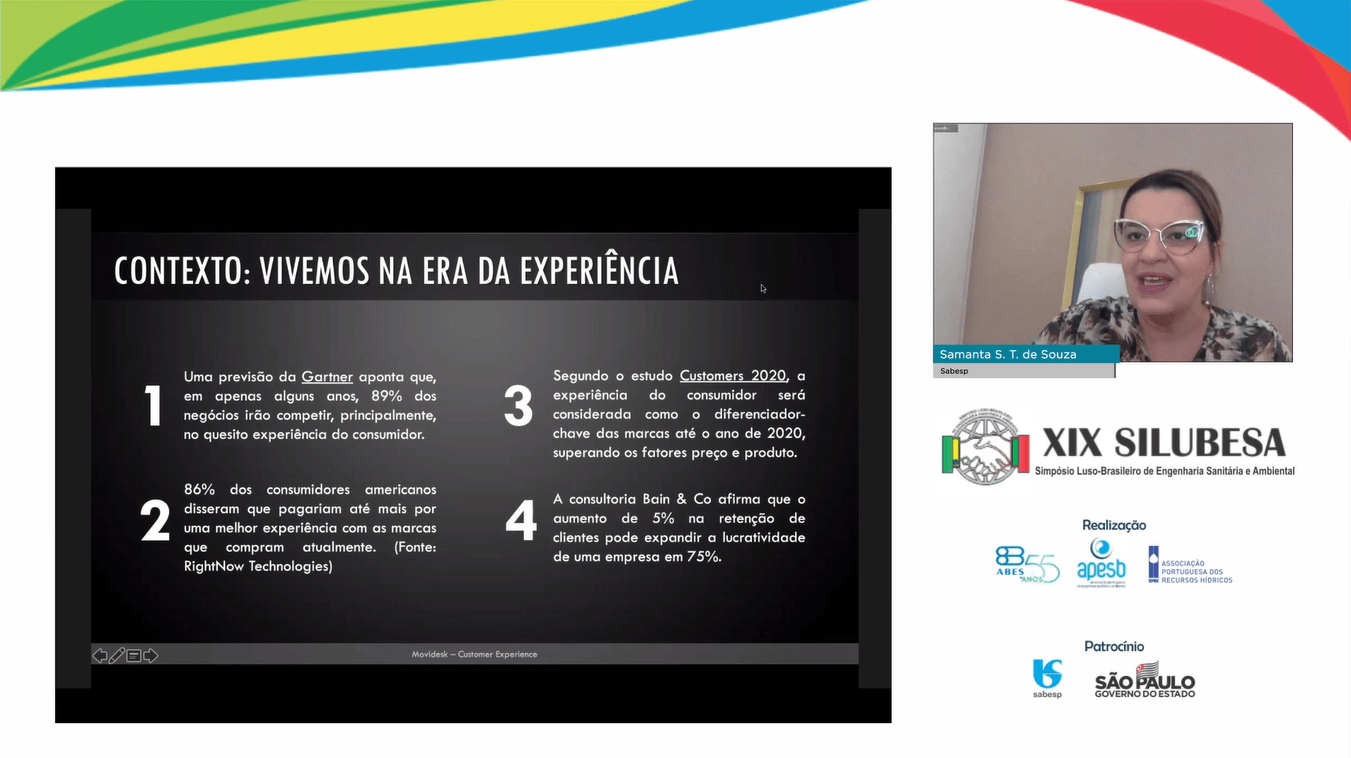 Em sua apresentação, Samanta Tavares Souza comentou sobre as análises da satisfação do cliente utilizadas na Sabesp, como o momento atual – a era da experiência – modificou a forma como o cliente se relaciona com a empresa e as expectativas que são geradas. Falou também sobre a mudança de hábitos dos consumidores com a pandemia, os fatores que o consumidor considera no relacionamento cliente/empresa, sendo os dois principais percebidos: confiança e competência, fatores que impactam diretamente na percepção geral e satisfação.