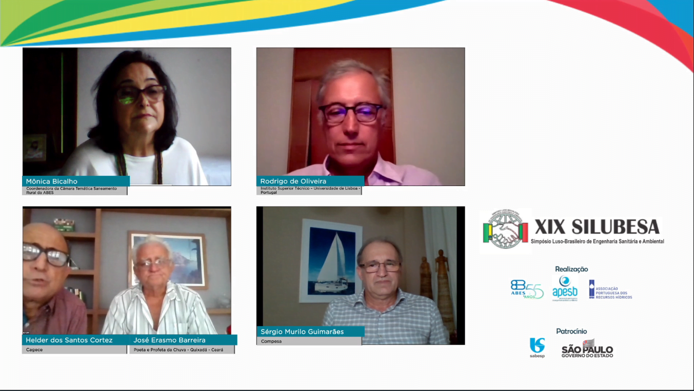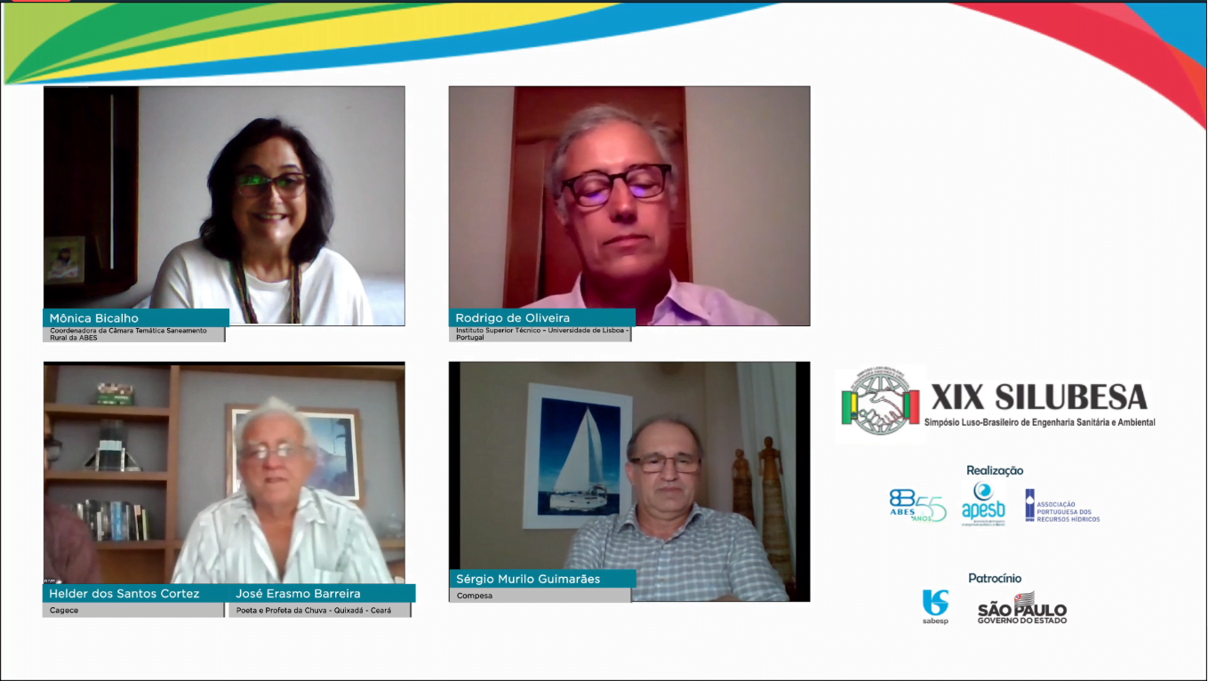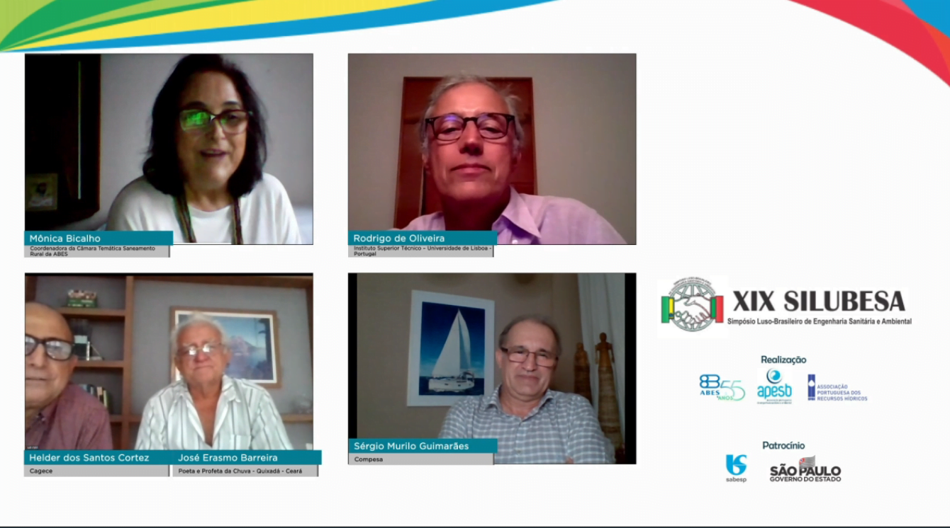 Com moderação de Mônica Bicalho, coordenadora da Câmara Temática Saneamento Rural da ABES, o painel contou com a participação de Rodrigo Proença de Oliveira, professor do Instituto Superior Técnico – Universidade de Lisboa e consultor na Bluefocus; Helder Cortez, diretor de Unidade de Negócios do Interior da Companhia de Água e Esgoto do Ceará (Cagece); José Erasmo Barreira, poeta e Profeta da Chuva de Quixadá, no Ceará; e Sérgio Murilo Guimarães, analista de Gestão da Diretoria Regional do Interior da Companhia Pernambucana de Saneamento (Compesa).