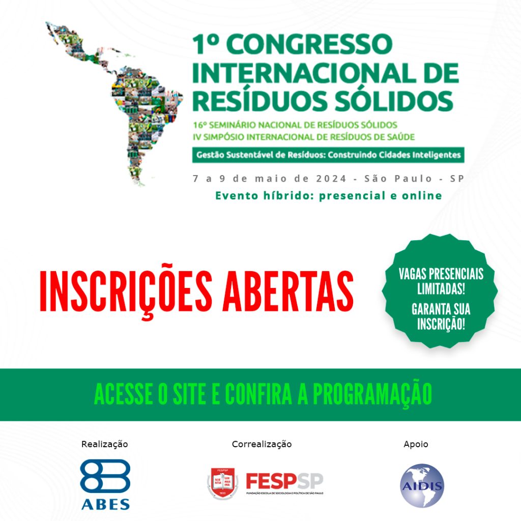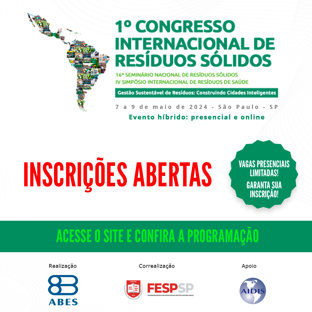 A Associação Brasileira de Engenharia Sanitária e Ambiental – ABES, por meio de sua Câmara Temática de Resíduos Sólidos, promoverá, de 7 a 9 de maio de 2024, o 1º Congresso Internacional de Resíduos Sólidos. O evento acontecerá de forma híbrida (presencial, na FESPSP – Fundação Escola de Sociologia e Política de São Paulo, e online, em plataforma exclusiva). As inscrições estão abertas aqui.
