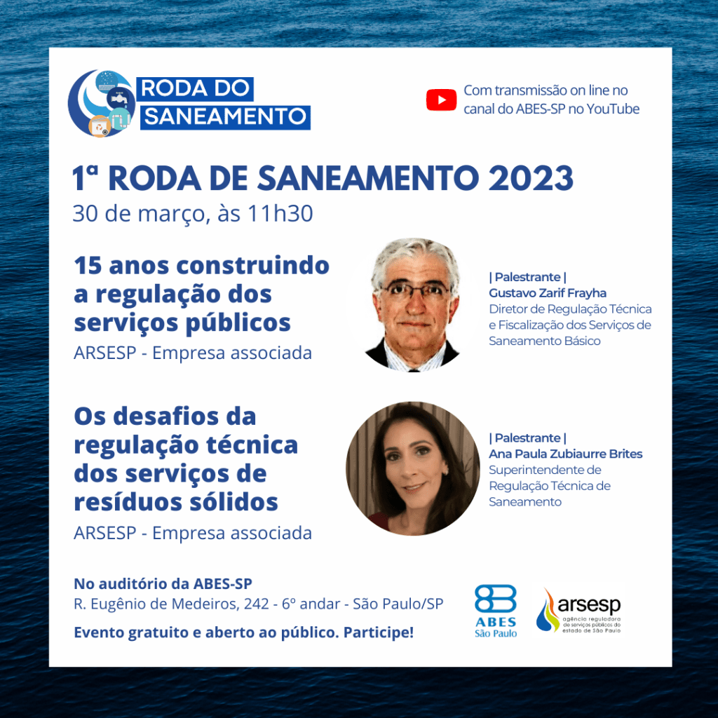A 1ª Roda do Saneamento 2023 da ABES Seção São Paulo 2023 acontecerá no doa 30 de março (quinta-feira), das 9h30 às 12h30, com palestras das empresas associadas: Aegea Saneamento, Aquapolo Ambiental e Arsesp – Agência Reguladora de Serviços Públicos do Estado de São Paulo (confira a programação abaixo).