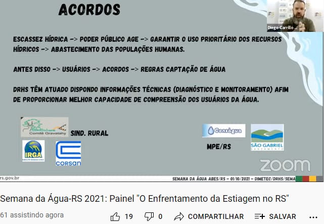 Na manhã desta sexta-feira, 1º de outubro, a Associação Brasileira de Engenharia Sanitária e Ambiental – ABES Seção Rio Grande do Sul (ABES-RS), em parceria com a Corsan (Companhia Riograndense de Saneamento), realizou o primeiro painel da série especial da Semana da Água-RS 2021.“O enfrentamento da estiagem no Rio Grande do Sul” foi o tema do debate de estreia.