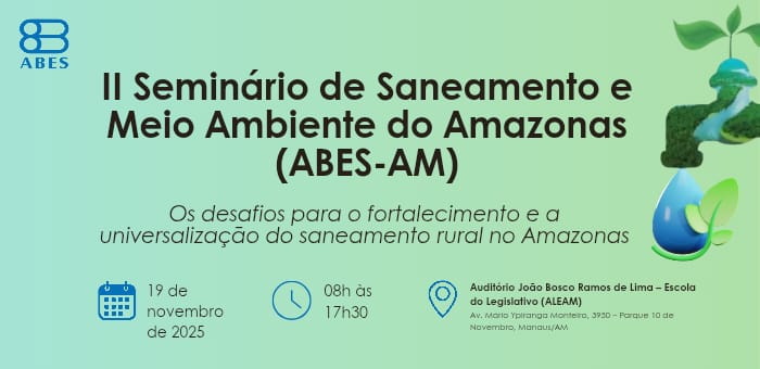 A Associação Brasileira de Engenharia Sanitária e Ambiental – Seção Estadual do Amazonas (ABES-AM) promove em 19 de novembro (quarta-feira), das 8h às 17h30, o II Seminário de Saneamento e Meio Ambiente do Amazonas. O tema do encontro é “Os desafios para o fortalecimento e a universalização do saneamento rural no Amazonas”. O evento será no auditório João Bosco Ramos de Lima, da Escola do Legislativo da Assembleia Legislativa do Estado do Amazonas (ALEAM).