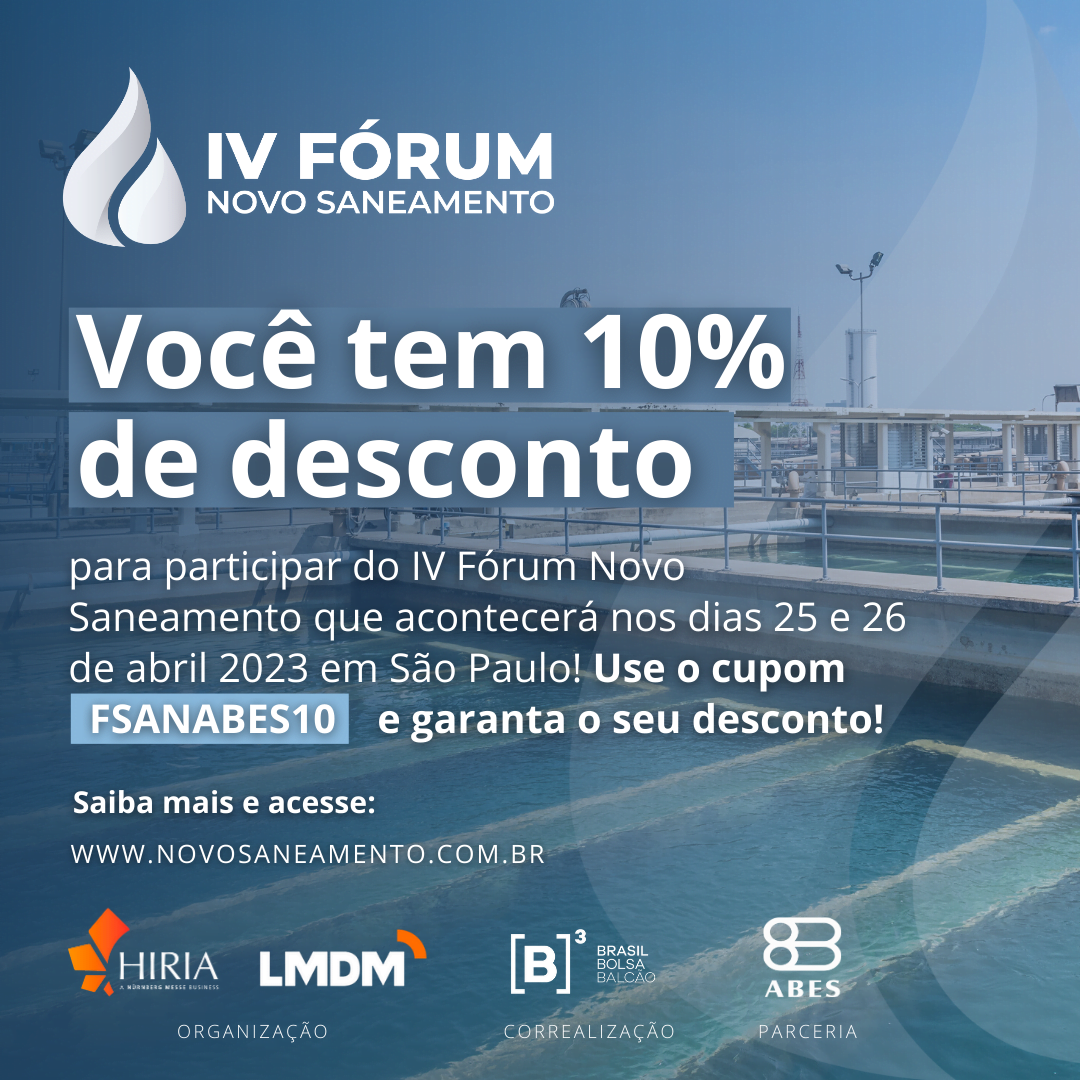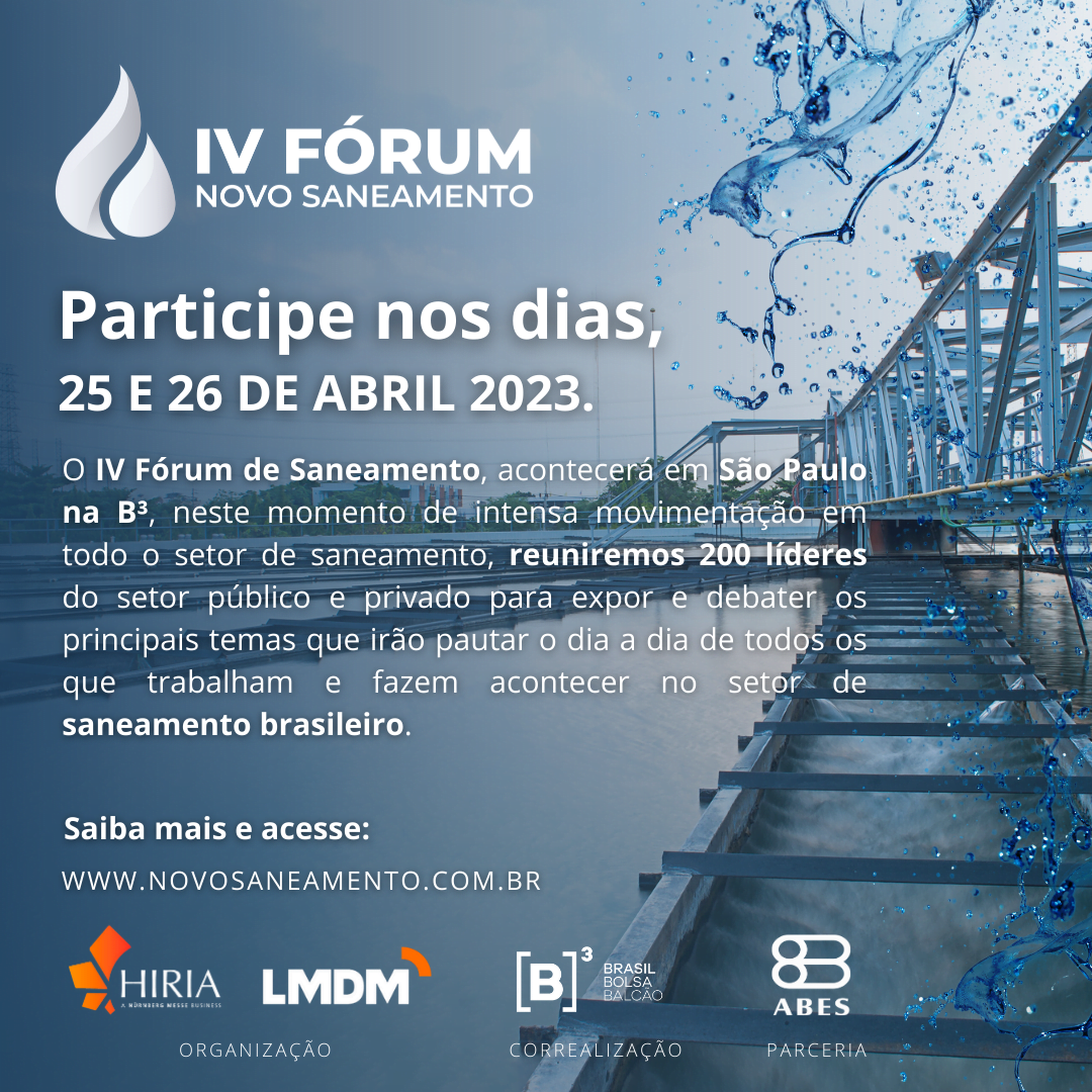 A Associação Brasileira de Engenharia e Ambiental – ABES é umas das entidades apoiadoras do IV Fórum Novo Saneamento, que será realizado nos dias 25 e 26 de abril, na Arena B3, em São Paulo. Associados têm 10% de desconto. Utilize o código FSANABES10. O evento é uma realização da HIRIA LMDM, com correalizaçao da B3.