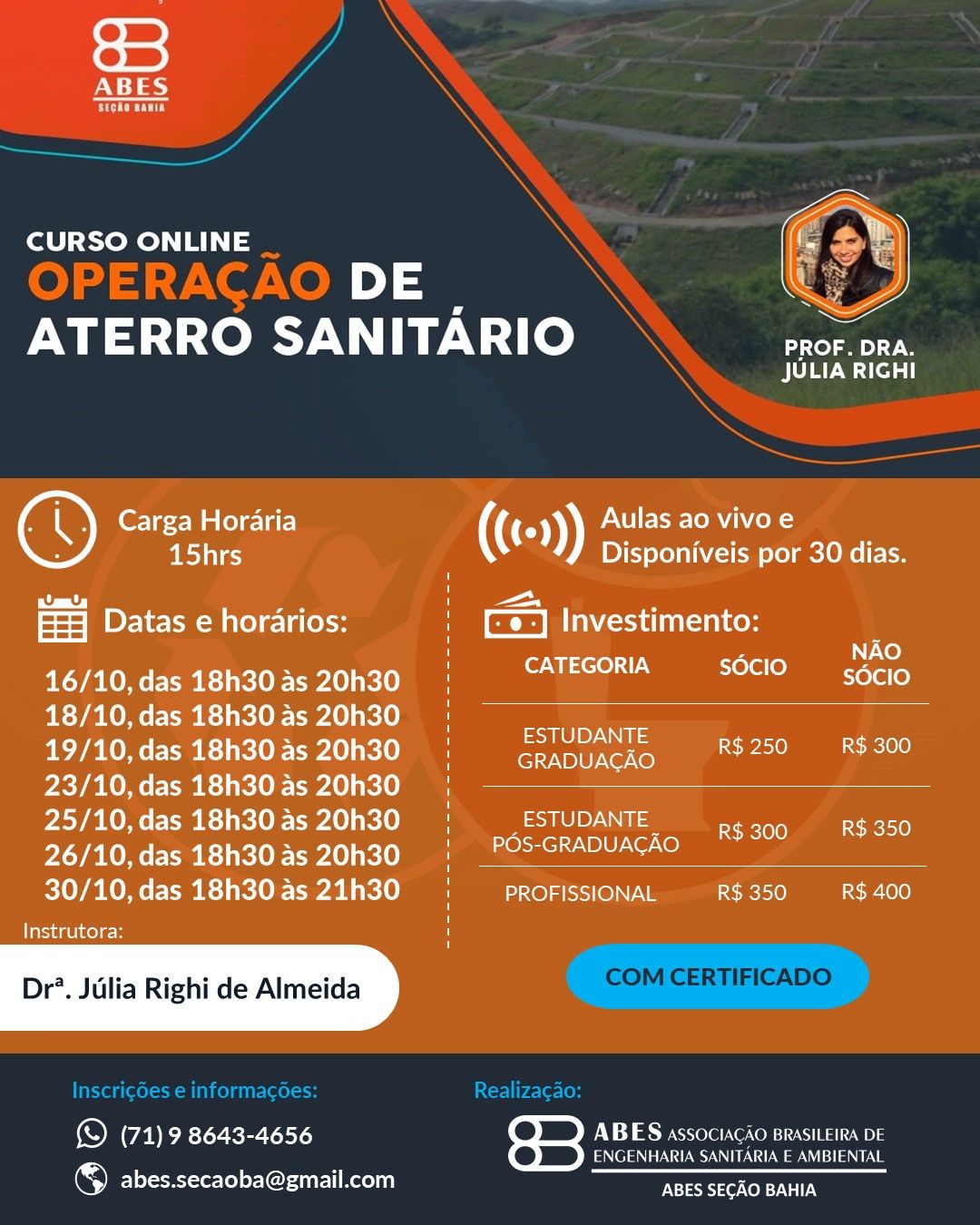 O segundo curso vai tratar sobre “Operação de Aterro Sanitário”, com a Profª. Dra. Júlia Righi, de 16 a 30 de outubro, das 18h30 às 20h30.