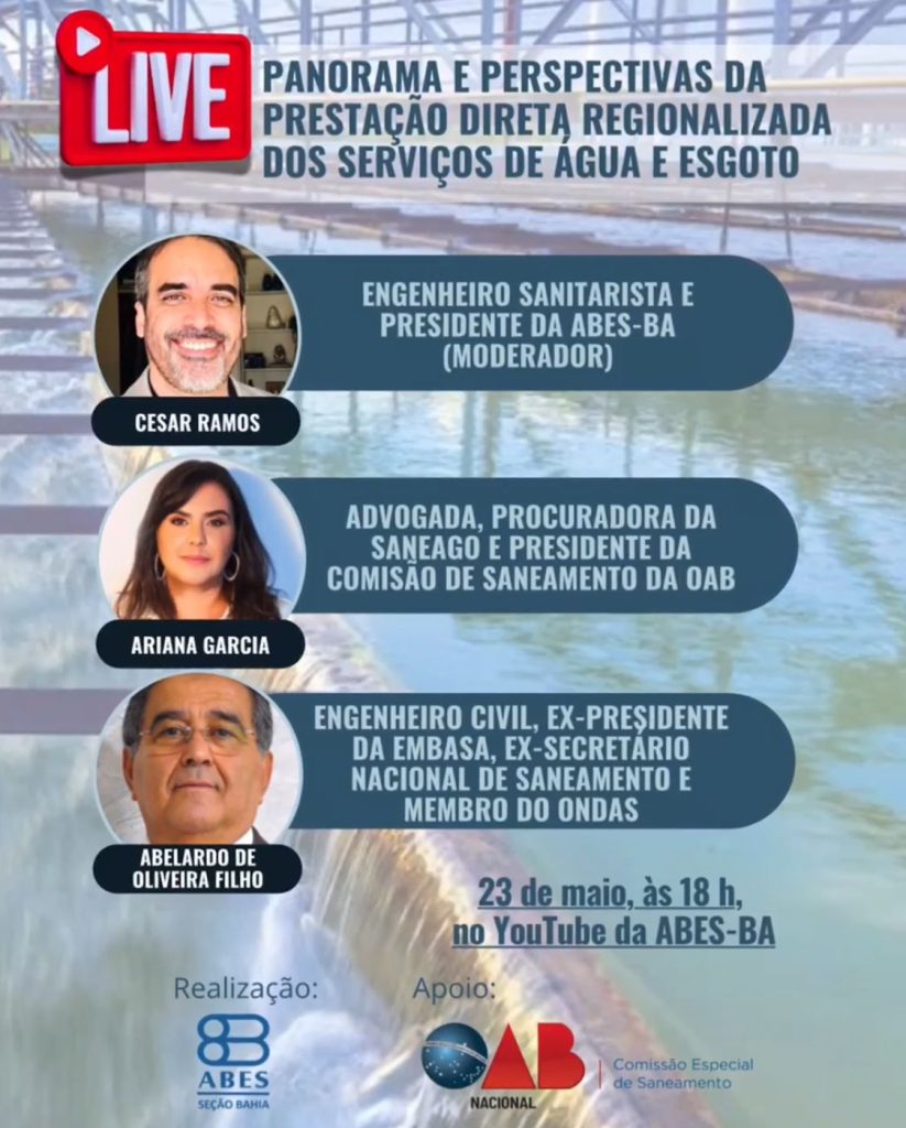 ABES-BA: assista à live sobre panorama e perspectivas da prestação de regionalizada dos serviços de água e esgoto, nesta quinta (23) 20/05/2024 Redação ABES Ao vivo no canal da ABES Bahia no YouTube (acesse aqui).