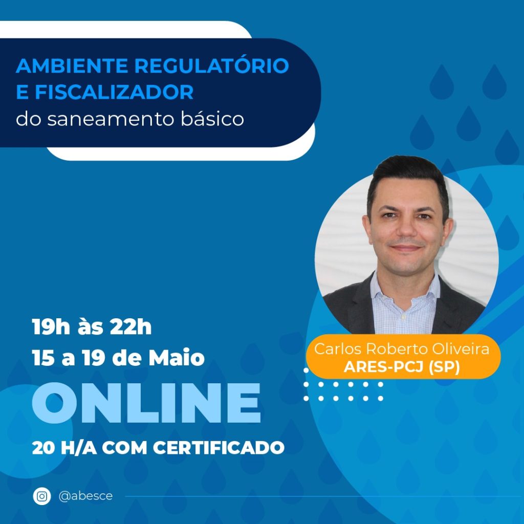 De 15 a 19 de maio, das 19h às 22h – curso online “Ambiente regulatório e fiscalizador do saneamento básico, com Carlos Roberto Oliveira – ARES-PCJ (SP)