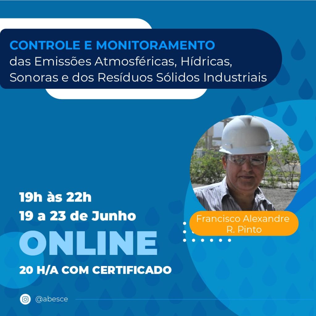 De 19 a 23 de junho, curso online “Controle e Monitoramento das Emissões Atmosféricas, Hídricas, Sonoras e dos Resíduos Sólidos Industriais”, com Francisco Alexandre R. Pinto.