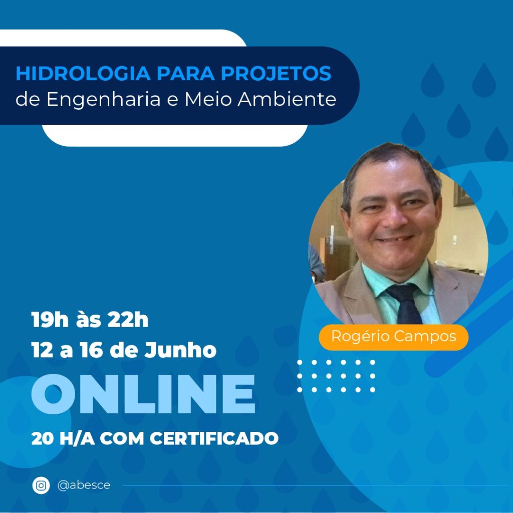 De 12 a 16 de junho, das 19h às 22h – curso online “Hidrologia para Projetos de Engenharia e Meio Ambiente”, com Rogério Campos