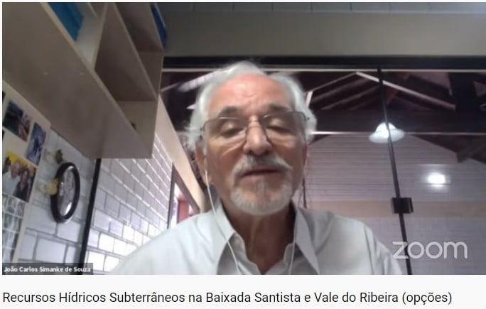 O palestrante João Carlos Simanke de Souza, doutor em Hidrogeologia e consultor, apresentou um Relatório de Situação do Comitê de Bacia Hidrográfica da Baixada Santista e da Região do Vale da Ribeira. João Simanke falou, ainda, sobre o novo marco regulatório do setor de saneamento, citando as sete leis que foram atualizadas. João apresentou, em primeira mão, uma cartilha sobre o funcionamento dos poços subterrâneos, lançada neste mês de março de 2021 pela ABAS – Associação Brasileira de Águas Subterrâneas, em parceria com o CEPAS – Centro de Pesquisa de Águas Subterrâneas da Universidade de São Paulo.