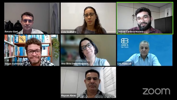 Em seguida, ele apresentou os convidados para o webinar: Luiz Pladevall, presidente da ABES-SP; Ana Sílvia Pereira, vice-presidente da ABES-RJ e professora da UERJ – Universidade Estadual do Rio de Janeiro e fundadora do Grupo Água de Reúso; Renato Giani Ramos, coordenador nacional da Câmara Temática de Dessalinização e Reúso da ABES; Sérgio Ayrimoraes, especialista da ANA – Agência Nacional de Águas e Saneamento Básico; Lívia Soalheiro, gerente de ESG no Grupo Águas do Brasil; e Maycon Rogério, diretor da ABES-SP.