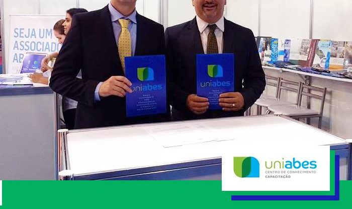 Nesta quarta-feira, 5 de abril, o presidente nacional da ABES, Roberval Tavares de Souza, e o presidente do SINDCON, Alexandre Lopes, assinaram, no estande das duas entidades, na Pollutec Brasil, um termo de parceria que dará aos associados do ABCON/SINDCON 10% de desconto nos cursos da UNIABES.