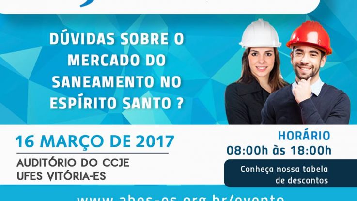A Associação Brasileira de Engenharia Sanitária e Ambiental – Seção Espírito Santo (ABES-ES) realizará no dia 16 de março o primeiro Workshop – Jovem Profissional do Saneamento do Espírito Santo. O objetivo do evento, que ocorrerá na Universidade Federal do Espírito Santo – UFES, é promover uma visão da atuação do profissional da área do saneamento e a troca de experiências entre os profissionais consagrados, os jovens profissionais e os estudantes. Inscrições aqui.