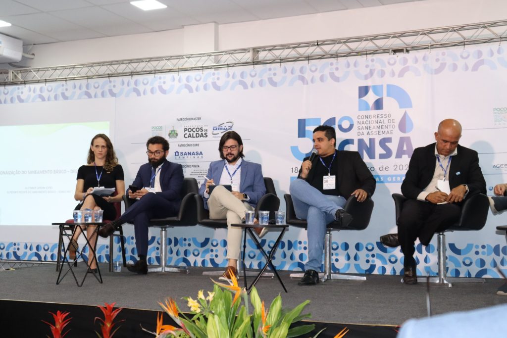 O membro da Diretoria da ABES-SP, Josivan Cardoso, participou do painel “Regionalização do saneamento básico – desafios”, com coordenação de Horácio da Silva Figueiredo, 1° Diretor de Assuntos Jurídicos da Assemae e assessor da Presidência da Companhia de Saneamento de Maricá – Sanemar – RJ. Os outros participantes foram: Manuelito Magalhães Júnior, vice-presidente da Assemae e presidente da Sanasa Campinas – SP, Sérgio Gonçalves, secretário executivo da Aesbe, Esmeraldo Pereira Santos, diretor de Comunicação Social da Assemae e diretor do SAAE de Passos – MG, Kleynner Jardim Lopes, superintendente de Saneamento Básico – SUSAB/Secretaria de Estado de Meio Ambiente e Desenvolvimento Sustentável – Semad – Governo do Estado de Minas Gerais, e Caroline Alvarenga Pertussatti, coordenadora do Marco Legal do Saneamento da Secretaria Nacional de Saneamento Ambiental do Ministério das Cidades.