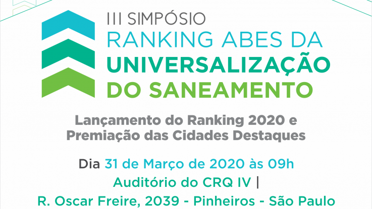A Associação Brasileira de Engenharia Sanitária e Ambiental – ABES promoverá, em 31 de março, o III Simpósio Ranking ABES da Universalização do Saneamento, com lançamento do Ranking edição 2020 (que avalia quase 2 mil municípios, que concentram 70% da população do país), debate e premiação das cidades que se destacam no levantamento.