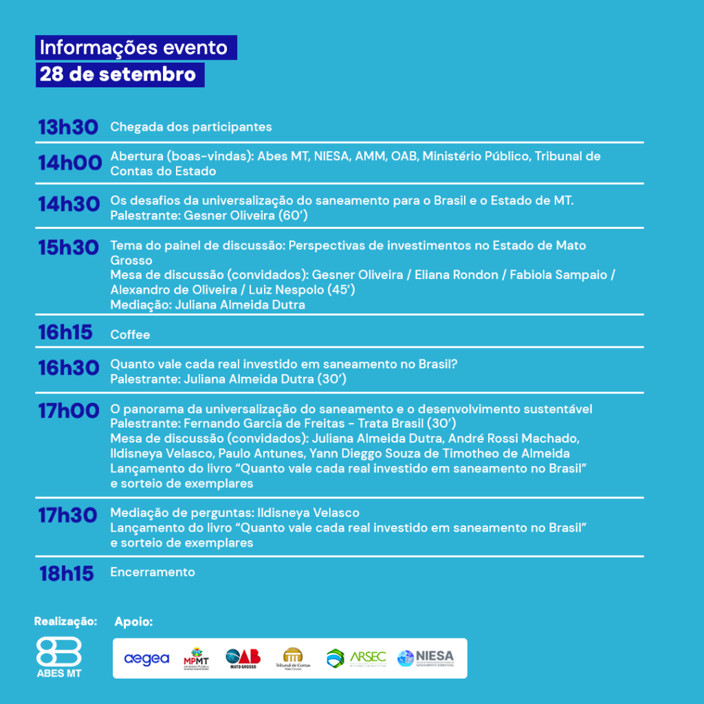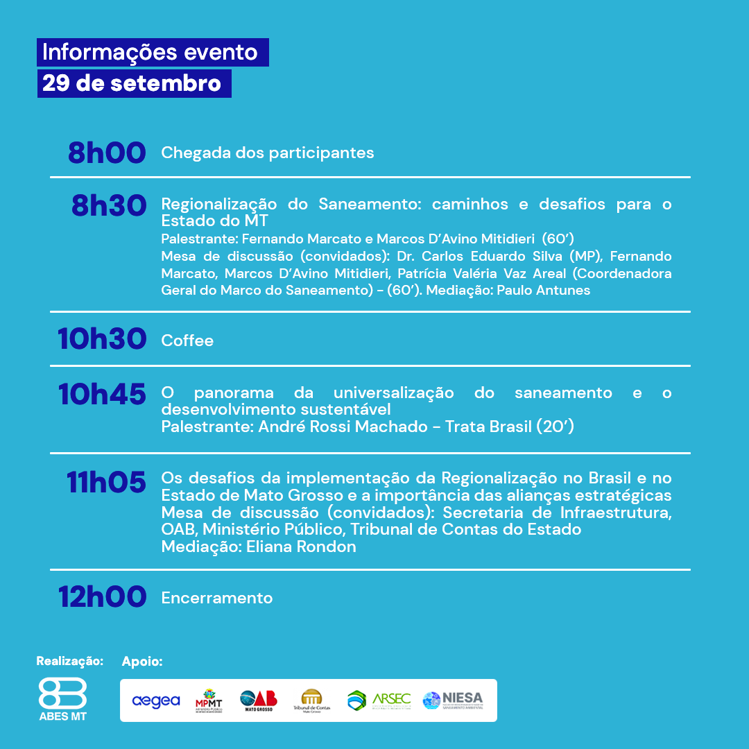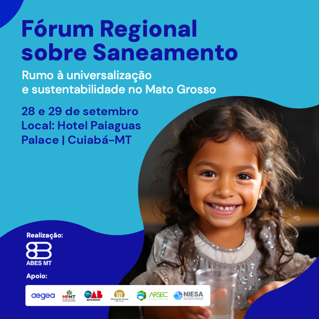 Realizado pela ABES-MT, o Fórum sobre Saneamento conta com o apoio da Aegea Saneamento, Ministério Público do MT, OAB, Tribunal de Contas do Estado, Agência Municipal de Regulação dos Serviços Públicos Delegados de Cuiabá-MT (ARSEC) e Núcleo Interdisciplinar de Estudos em Saneamento Ambiental (NIESA), ligado à UFMT.