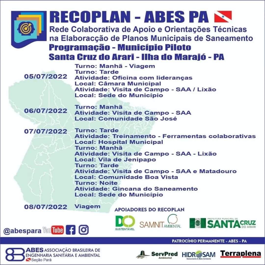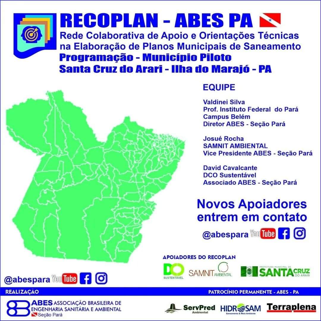 A Associação Brasileira de Engenharia Sanitária e Ambiental Seção Seção Pará (ABES-PA) lançou em dezembro de 2021 a Rede Colaborativa de Apoio e Orientações Técnicas na Elaboração de Planos Municipais de Saneamento (RECOPLAN). O objetivo de difundir estratégias que possam vir a ser utilizadas por municípios no processo de elaboração de seus Planos Municipais de Saneamento Básico (PMSB).