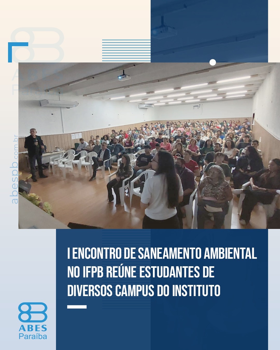 A ABES Paraíba realizou nesta quarta-feira, 20 de setembro, o I Encontro de Saneamento Ambiental no IFPB. O evento contou com a participação de cerca de 250 alunos, professores e convidados do Instituto, de diversos Campus, como de João Pessoa, de Patos e de Campina Grande.