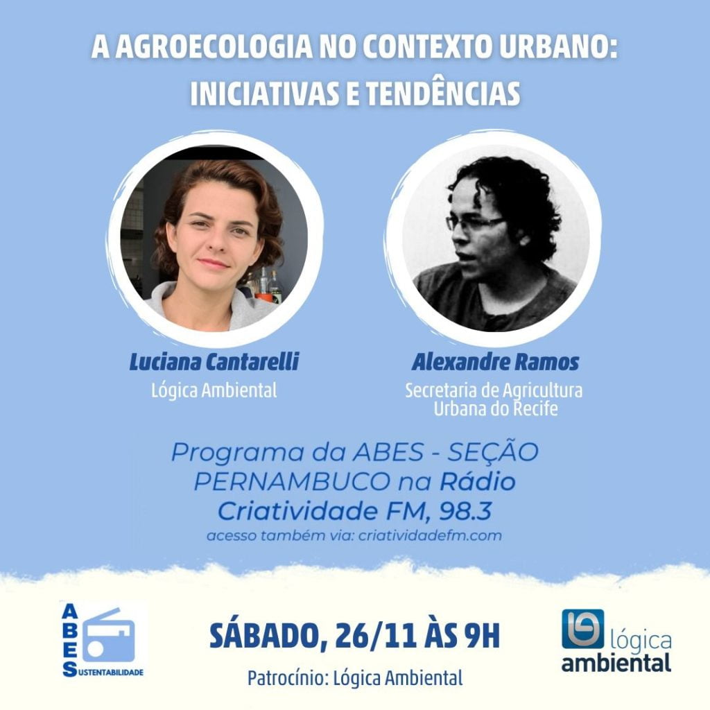 O programa da Associação Brasileira de Engenharia Sanitária e Ambientak Seção Pernambuco (ABES-PE) deste sábado, 26 de novembro, na rádio Criatividade FM 98.3, receberá especialistas para falar sobre iniciativas e tendências da agroecologia no contexto Urbano. As convidas para abordar o tema são Luciana Cantarelli, da Lógica Ambiental, e Alexandre Ramos, da Secretaria de Agricultara Urbana do Recife.
