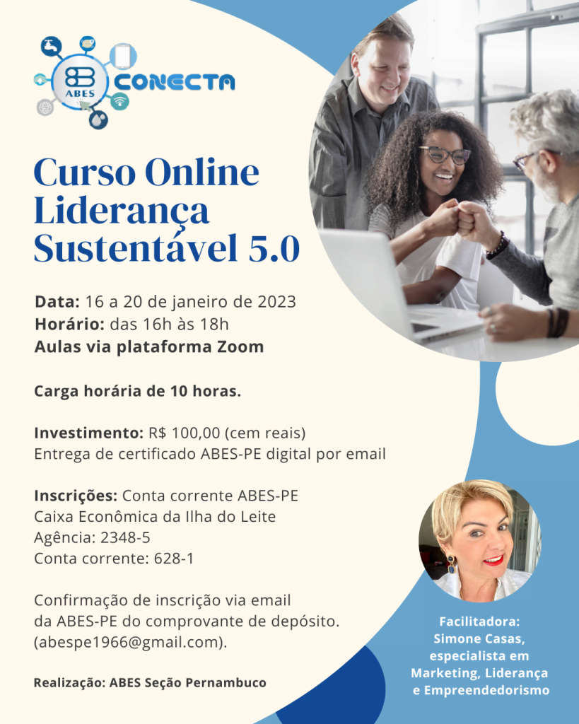 A ABES Seção Pernambuco promoverá o curso online Liderança Sustentável 5.0. As aulas acontecerão de 16 a 20 de janeiro, das 16 às 18h, e serão ministradas por Simone Casas, especialista em Marketing, Liderança e Empreendedorismo. Garanta sua vaga.