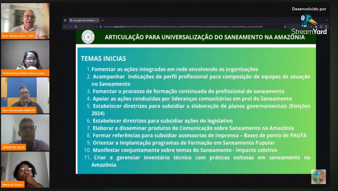 A reunião foi conduzida pelo engenheiro sanitarista Valdinei Silva, professor do Instituto Federal do Pará (IFPA) e pesquisador do Grupo Integrado de Estudos Ambientais (GEAM) e do Grupo de Pesquisa Hidráulica e Saneamento (GPHS). Além de Roseane, Davi e outros integrantes, Maria do Carmo da Silva Santos, presidente da AESPA – Associação dos Engenheiros Sanitaristas do Pará (AESPA), também esteve presente no evento.