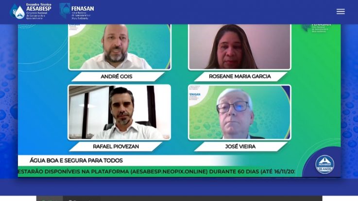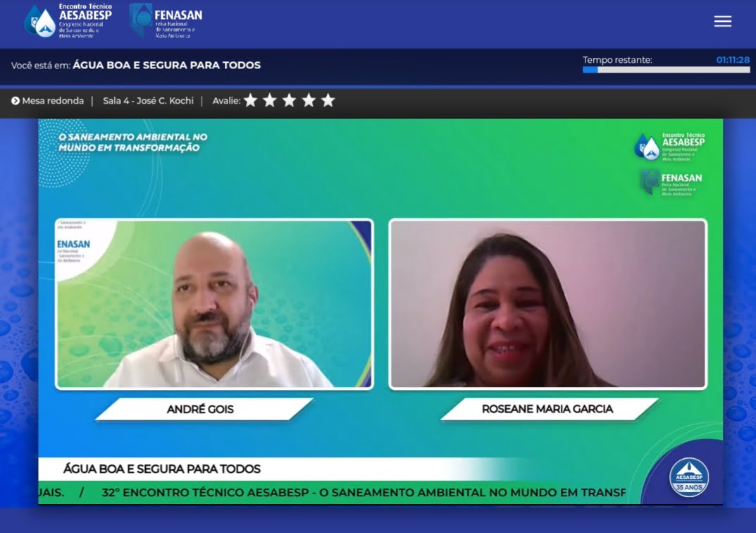 A diretora da ABES-SP e coordenadora das Câmaras de Saúde Ambiental e Resíduos Sólidos da entidade, Roseane M. Lopes Garcia de Souza, participou, nesta terça-feira, 14 de setembro, do 32º Encontro Técnico AESabesp/Fenasan 2021, promovido pela Associação dos Engenheiros da Sabesp – AESabesp. Roseane foi palestrante na mesa redonda “Água boa e segura para todos”.