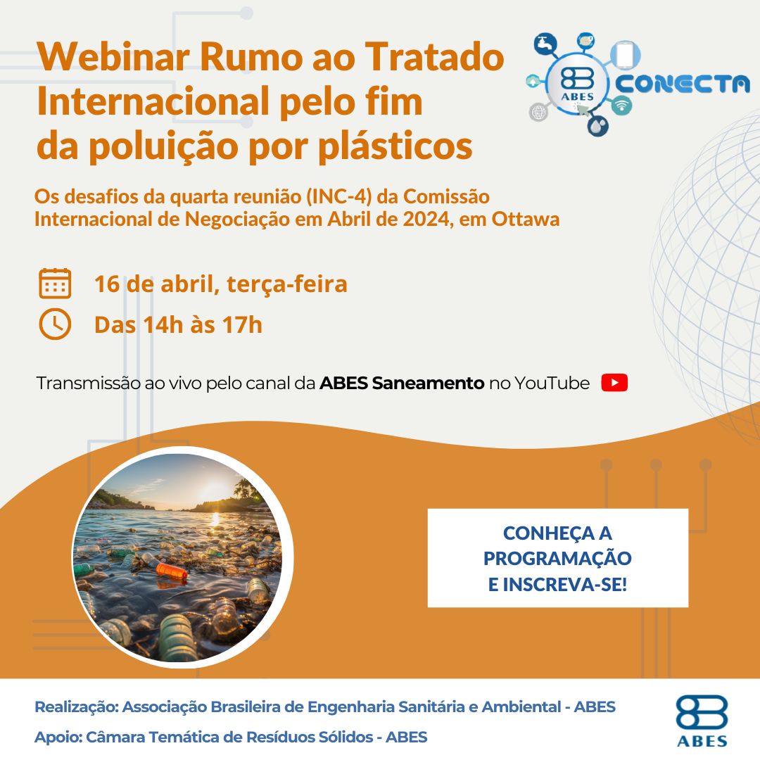 A Associação Brasileira de Engenharia Sanitária e Ambiental – ABES, com apoio de sua Câmara Temática de Resíduos Sólidos, realizará o evento online “Rumo ao Tratado Internacional pelo fim da poluição por plásticos. Os desafios da quarta reunião (INC-4) da Comissão Internacional de Negociação em Abril de 2024, em Ottawa“. O encontro gratuito acontecerá em 16 de abril (terça-feira), das 14h às 17h, com transmissão ao vivo pelo canal da entidade no YouTube. As inscrições estão abertas aqui.