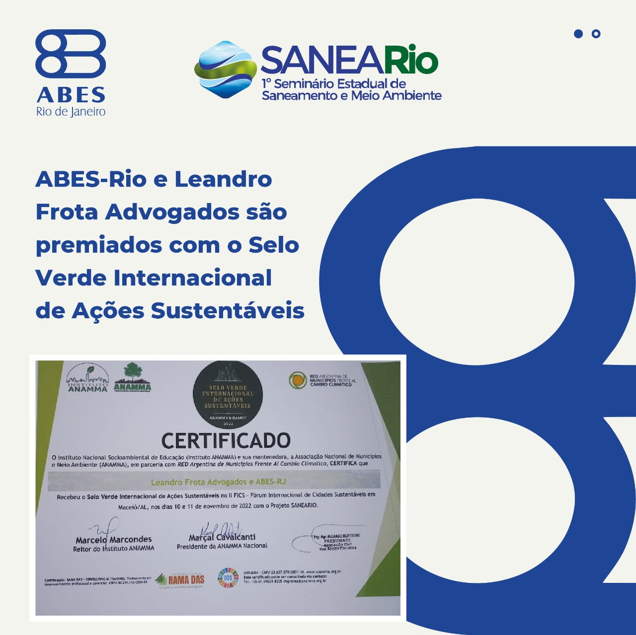 A Associação Nacional de Municípios e Meio Ambiente – ANAMMA, em parceria com a RED Argentina de Municípios Frente Al Cambio Climático, concedeu à Associação Brasileira de Engenharia Sanitária e Ambiental Seção Rio de Janeiro (ABES-Rio) e a Leandro Frota Advogados o Selo Verde Internacional de Ações Sustentáveis pelo projeto SANEA-Rio. A cerimônia de premiação aconteceu no início de novembro em Maceió – AL, durante o II FICS – Fórum Internacional de Cidades Sustentáveis.