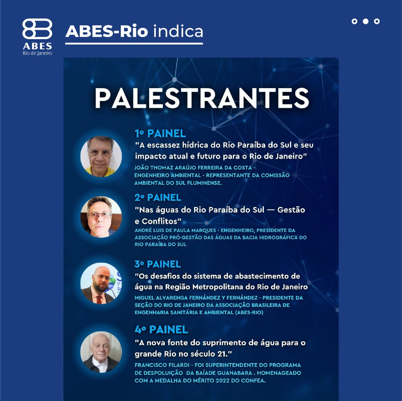 O evento contará com quatro painéis de debate, sendo o terceiro apresentado pelo presidente da ABES-Rio, com o tema “Os Desafios do sistema de abastecimento de água na Região Metropolitana do Rio de Janeiro”.