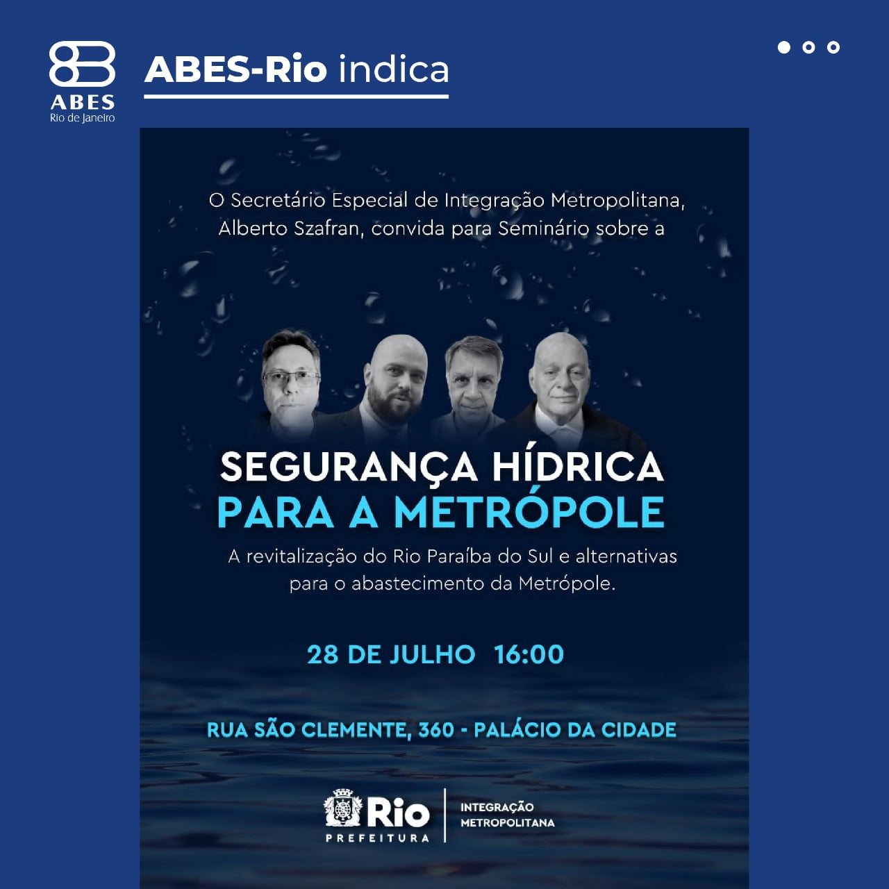 O presidente da ABES Seção Rio de Janeiro, Miguel Fernández y Fernández, integrará o Seminário sobre a Segurança Hídrica para a Metrópole, que acontecerá nesta quinta-feira, 28 de julho, às 16h, no Palácio da Cidade, no Rio de Janeiro/RJ.