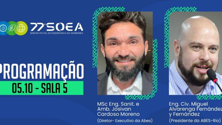Nesta quarta-feira, 5 de outubro, às 16h30, representantes da Associação Brasileira de Engenharia Sanitária e Ambiental Seção Rio de Janeiro (ABES-Rio) participarão da 77ª edição da Semana Oficial da Engenharia e da Agronomia – SOEA. Miguel Fernández, presidente da ABES Rio, Josivan Cardoso, diretor executivo da ABES, e Leandro Frota, da OAB-RJ e associado a ABES-Rio, integrarão um debate sobre os desafios da universalização do saneamento básico no Brasil com o novo Marco Legal.