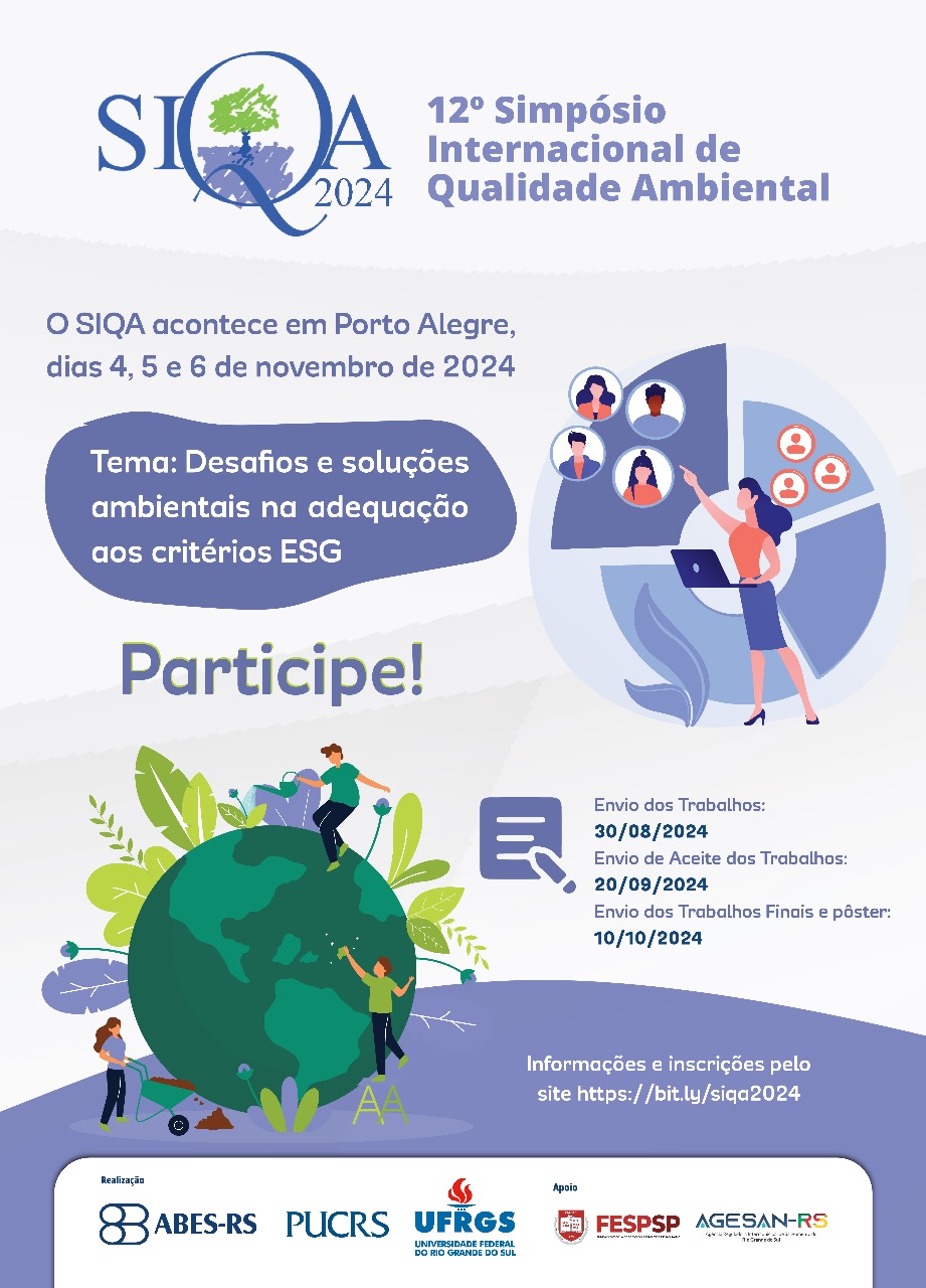 Novas datas. Entre e os dias 4 e 6 de novembro, Porto Alegre sediará a 12ª edição do Simpósio Internacional de Qualidade Ambiental – SIQA. Promovido pela Associação Brasileira de Engenharia Sanitária e Ambiental Seção Rio Grande do Sul (ABES-RS), o evento terá como fio condutor das discussões o tema “Desafios e soluções ambientais na adequação aos critérios ESG. O encontro acontecerá no Hotel Plaza São Rafael, na capital gaúcha. Para se inscrever, enviar seu trabalho técnico até 30 de agosto e conferir a programação acesse aqui.
