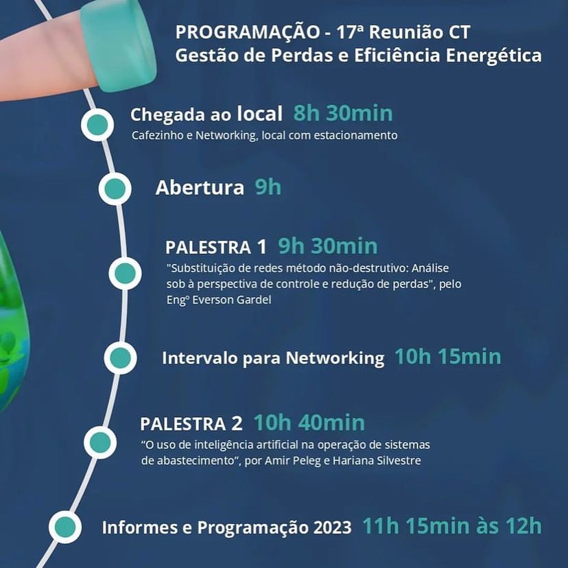 O evento contará com apresentação das palestras “Substituição de redes método não-destrutivo: análise sob a perspectiva de controle e redução de perdas”, com o Engº Everson Gardel; e “Uso de inteligência artifical na operação de sistemas de abastecimento”, com Amanco-Wavin/Takadu