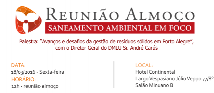 A primeira edição de 2016 da Reunião Almoço “Saneamento Ambiental em Foco”, promovida Associação Brasileira de Engenharia Sanitária e Ambiental – Seção Rio Grande do Sul (ABES-RS), terá como palestrante o diretor geral do Departamento Municipal de Limpeza Urbana (DMLU) de Porto Alegre, André Carús. Na ocasião, será abordado o tema “Avanços e desafios da gestão de resíduos sólidos em Porto Alegre”.