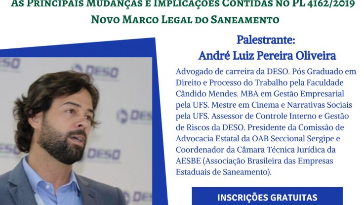 O primeiro encontro ocorrerá no auditório da DESO (Rua Campo do Brito, 331 – 13 de Julho), e contará com a participação do advogado de carreira da DESO André Luis Pereira Oliveira, presidente da Comissão de Advocacia Estatal da OAB Seccional Sergipe e Coordenador da Câmara Técnica Jurídica da AESBE (Associação Brasileira das Empresas Estaduais de Saneamento). O palestrante abordará o tema “As principais mudanças e implicações contidas no PL 4162/2019 – Novo Marco Legal do Saneamento”.