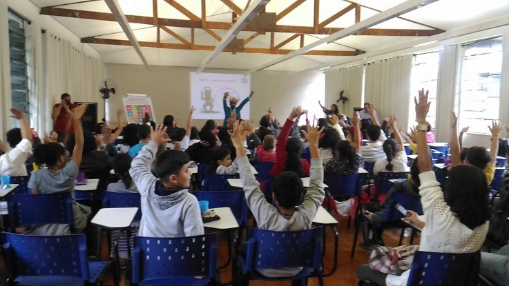 A ABES-SP – Associação Brasileira de Engenharia Sanitária e Ambiental – ABES Seção São Paulo (ABES-SP) promoveu nesta quinta, 9 de novembro, a cerimônia de Premiação e encerramento do DIADESOL – 8º Concurso de Desenho Infantil e 12ª Concurso de Vídeo Amador. Antes da premiação, um público participativo, composto por 35 alunos da Escola Estadual Professora Nildese Martins de Almeida, assistiu a uma palestra com o convidado especial “Caipira – O Amigo do Planeta”, que de forma divertida ensinou e encantou as crianças, reforçando as questões sobre os resíduos sólidos e a importância dos 5Rs – Repensar, Recusar, Reduzir, Reutilizar e Reciclar. Ao todo, foram 64 pessoas presentes.
