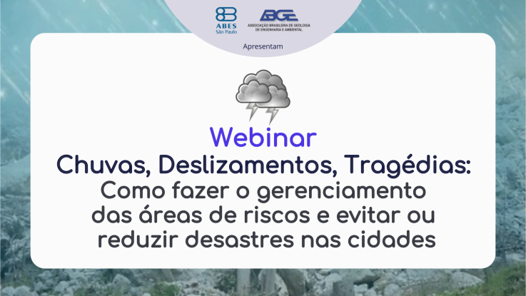 A Associação Brasileira de Engenharia Sanitária e Ambiental – Seção São Paulo (ABES-SP) e a Associação Brasileira de Geologia de Engenharia e Ambiental (ABGE) realizarão, na próxima terça-feira, dia 3 de maio, às 15h, o webinar “Chuvas, Deslizamentos, Tragédias: Como fazer o gerenciamento das áreas de riscos e evitar ou reduzir desastres nas cidades”. Clique aqui para se inscrever.
