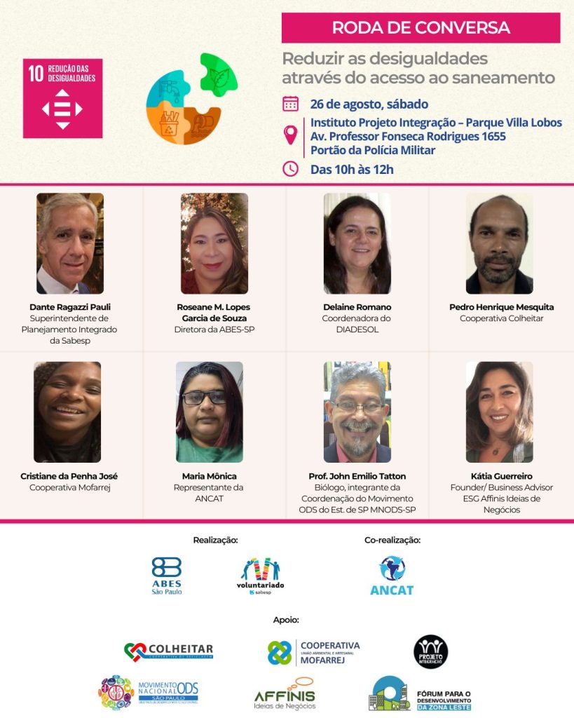 Para celebrar o Dia Nacional do Voluntariado (28 de agosto), a ABES Seção São Paulo e o Programa de Voluntariado Empresarial Sabesp realizarão uma Roda de Conversa com o tema “Reduzir as desigualdades através do acesso ao saneamento”. O evento ocorrerá no dia 26 (sábado), no Instituto Projeto Integração – Parque Villa Lobos, das 10h às 12h. Inscreva-se neste link.