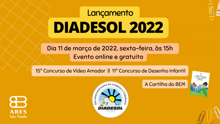 A Associação Brasileira de Engenharia Sanitária e Ambiental – Seção São Paulo (ABES-SP) promoverá, nesta sexta-feira, dia 11 de março, às 15h, o webinar de lançamento do DIADESOL 202. A campanha de conscientização sobre questões relacionadas aos resíduos sólidos promove, entre outras ações de educação ambiental, os Concursos de Desenho Infantil (do qual participam estudantes de escolas públicas e privadas) e Vídeo Amador (estudantes e público em geral).
