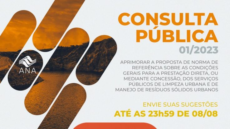 Até a próxima terça-feira, 8 de agosto, está aberta a Consulta Pública nº 01/2023 da Agência Nacional de Águas (ANA) sobre a norma de referência (NR) que abordará as condições gerais para a prestação, direta ou mediante concessão, dos serviços públicos de limpeza urbana e de manejo de resíduos sólidos. As contribuições da sociedade podem ser envidadas por meio do formulário disponível neste link.