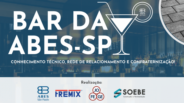 Sucesso de participação, o Bar da ABES-SP está de volta! A primeira edição de 2022 será realizada no dia 28 de abril, quinta-feira, às 18h, com o tema Pavimento Sustentável, e contará com palestras de Valmir Bonfim, CEO da FREMIX Pavimentação e Construções, que falará sobre Agregado Reciclado e Base Espumada, e Liedi Bernucci, Diretora-Presidente do IPT – Instituto de Pesquisas Tecnológicas do Estado de São Paulo, que abordará Revestimentos Asfálticos Sustentáveis. Vagas limitadas. Clique aqui e inscreva-se.