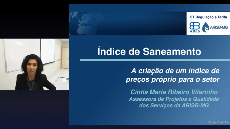 A Câmara Temática de Regulação e Tarifa da ABES, coordenada pela engenheira Marisa Guimarães, promoveu nesta terça-feira, 20 de agosto, o webinar “Índice de Saneamento: criação de um índice de preços próprio para o setor”, com a palestrante Cíntia Vilarinho, assessora de Projetos e Qualidade da ARISB-MG (para assistir à vídeo-aula, acesse aqui).