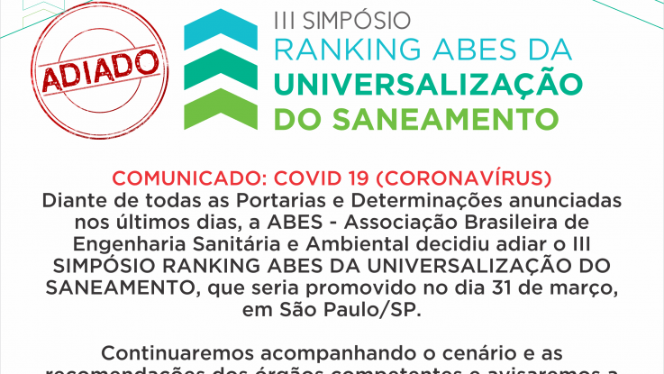 Diante de todas as Portarias e Determinações anunciadas nos últimos dias, a ABES – Associação Brasileira de Engenharia Sanitária e Ambiental decidiu adiar o III SIMPÓSIO RANKING ABES DA UNIVERSALIZAÇÃO DO SANEAMENTO, que seria promovido no dia 31 de março, em São Paulo/SP.