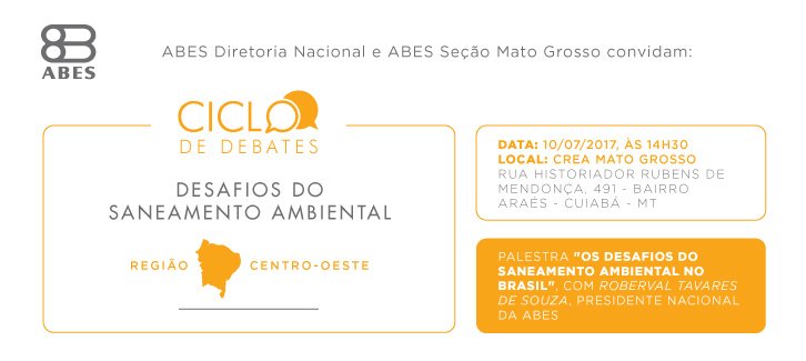 O Ciclo de Debates “Desafios do Saneamento Ambiental no Brasil” será realizado em Cuiabá, no Mato Grosso, no dia 10 de julho, às 14h30. Na oportunidade, o presidente nacional da ABES, Roberval Tavares de Souza, ministrará palestra sobre os 10 anos da Lei de Saneamento e o saneamento na Região Centro-Oeste e no Mato Grosso. A programação contempla também um debate sobre o tema “saneamento público e privado”.