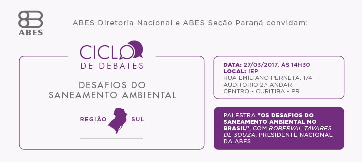 O encontro faz parte do Ciclo de Debates “Desafios do Saneamento Ambiental” e tem promoção da Diretoria Nacional da ABES e da ABES Seção Paraná. O mesmo evento já ocorreu em Manaus, no último dia 15 de março, e acontecerá nesta segunda-feira, 20, em Goiânia (veja mais aqui).