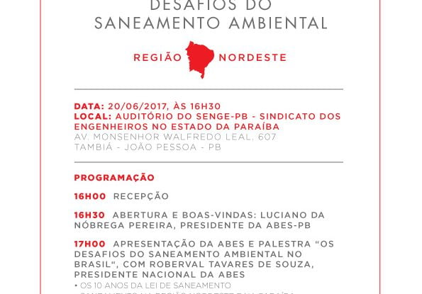 A Associação Brasileira de Engenharia Sanitária e Ambiental – ABES promoverá, no dia 18 de julho, às 16h30, em João Pessoa, na Paraíba, o Ciclo de Debates “Desafios do Saneamento Ambiental no Brasil”. Na ocasião, o presidente nacional da ABES, Roberval Tavares de Souza, ministrará palestra acerca dos 10 anos da Lei de Saneamento e o saneamento na Região Nordeste e na Paraíba. A programação conta também com um debate sobre o tema “saneamento público ou privado”.